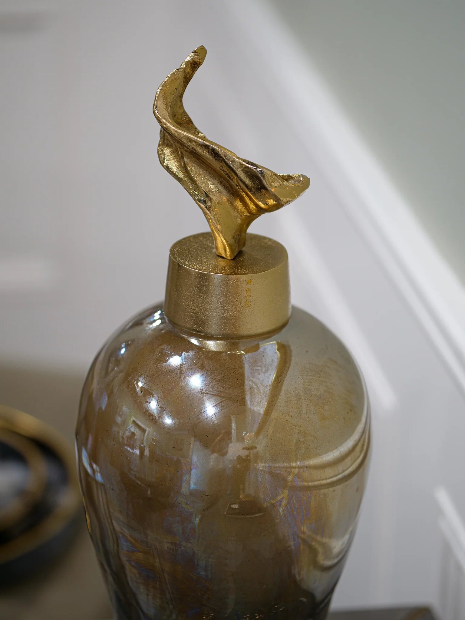 - Stunning glazed decorative jar, a beautiful blend of charcoal grey, gold and amber tones finished off with a statement gold lid. Style individually or as a trio with matching Camelot Jars in Small and Medium.