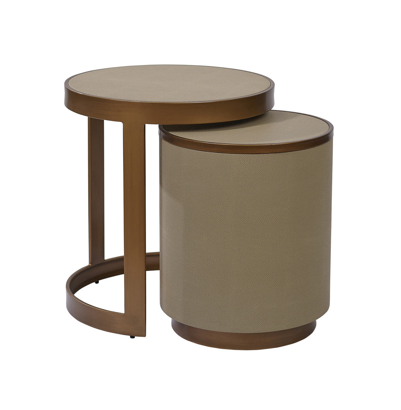 Each piece features a luxurious faux shagreen finish, crafted with intricate pebbly leatherette in a soft sandstone and beige with an antique gold trim. Create an alluring and luminous ambiance with this exotic and enigmatic set, perfect for any chic, modern living space.