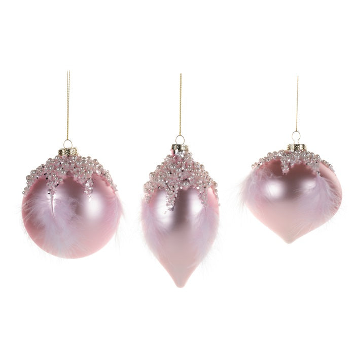GLASS PEARL PINK BAUBLES WITH FEATHER 10CM GOODWILL COLLECTION