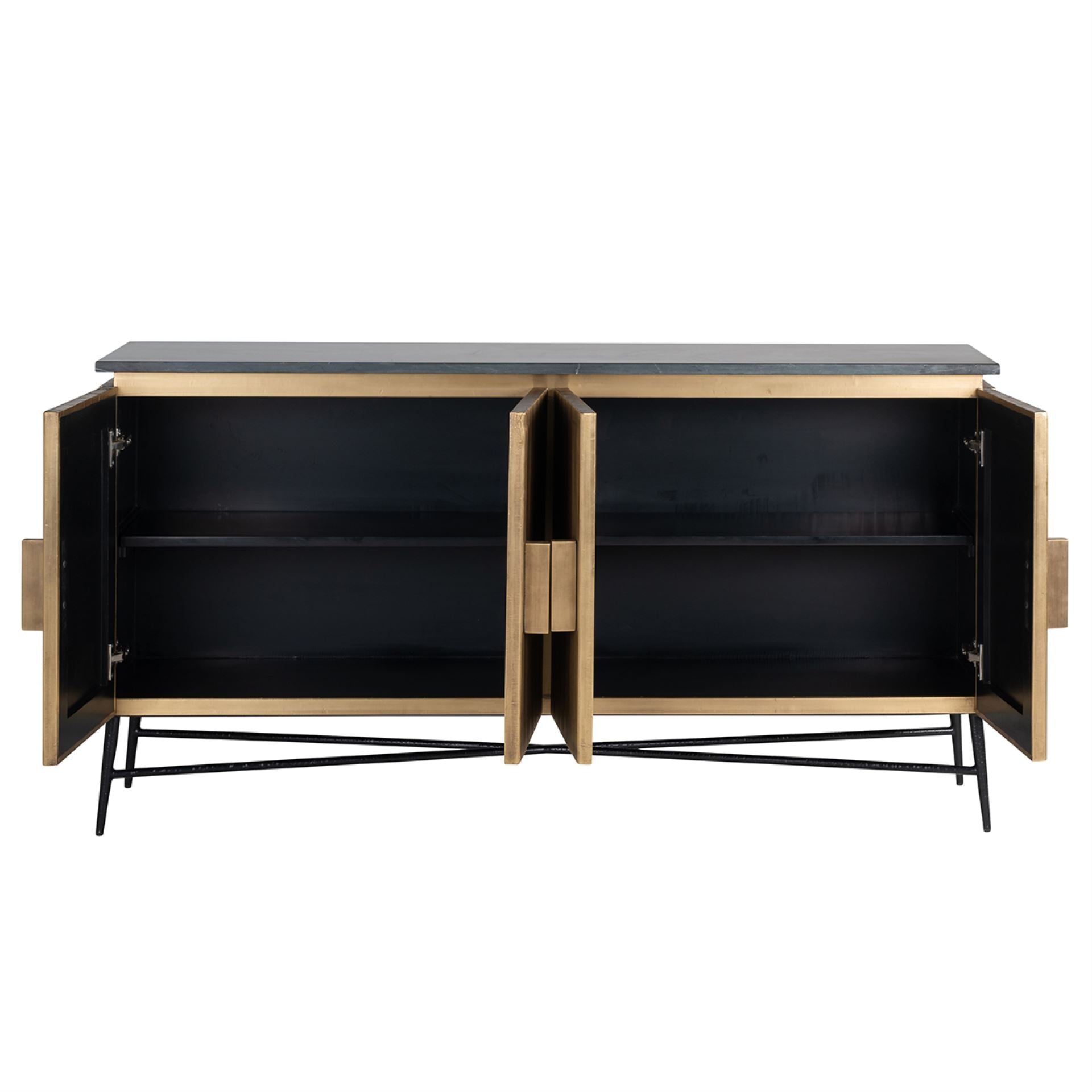 Sideboard Ironville 4-doors is a unique sideboard in gold/brass with ribbed relief and black marble top. Mid-Century Modern style (sixties) in a new look!